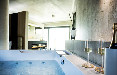 Espace bien être privé: Profitez d'une grande baignoire balnéothérapie, d'une double douche à l'italienne effet mosaïque, ainsi que d'un sauna infrarouge pour une détente totale.