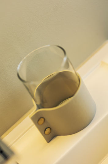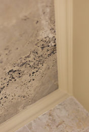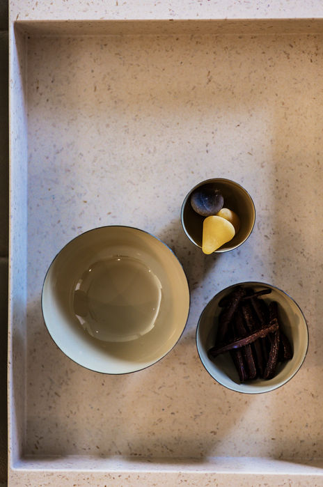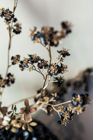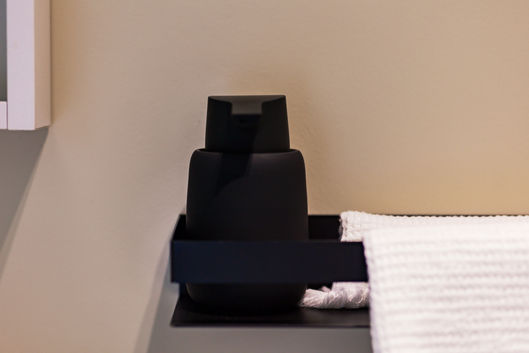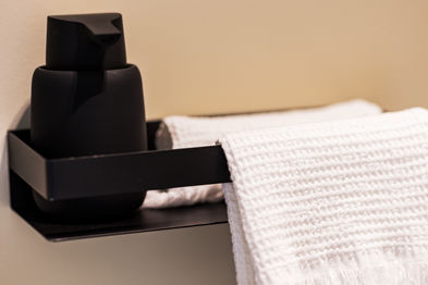 Décoration élégante et chaleureuse: Matériaux nobles et éléments design (Blomus, senteur Baobab, fausses bougies, savon, tentures en velours bleu nuit) créent une atmosphère cosy et raffinée.