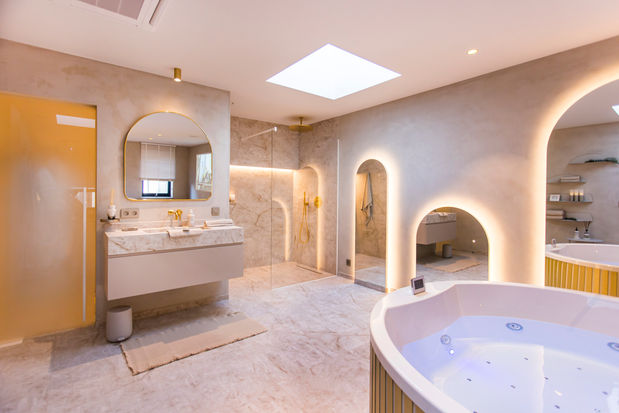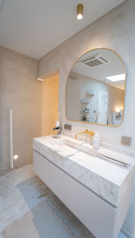 Habillé de teintes beiges et d'accents or, ce lieu de 50m2 intime évoque les paysages sahariens, le sable chaud sous les pieds, et le confort absolu d'un refuge luxueux.